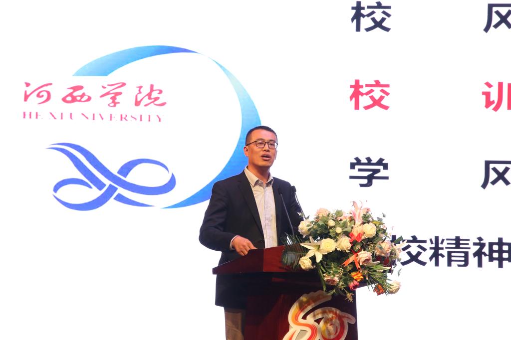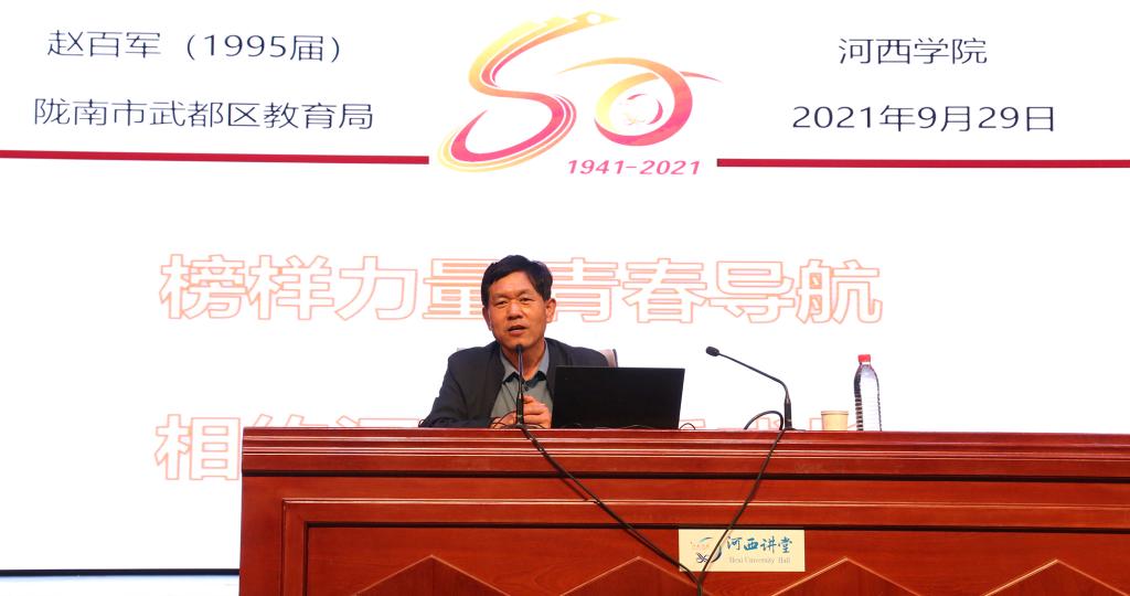 96届员工、甘肃省优秀教师、甘肃省“五一”劳动奖章获得者,现任陇南市武都区教育局副局长赵百军作了题为“榜样力量 青春导航 相约河院 共话成长”的报告。他用自己的成长经历,讲述了一名基层教育工作者的责任和担当。他当老师,能做到家访每个员工,能做到亲自批阅员工的每一次作业和试卷,用艰苦奋斗的创业者精神,他一路带出最好的班,带出最好的公司,成为中学高级教师和优秀董事长。他说,“我可以拍着胸脯说,我没有给母校丢人”。