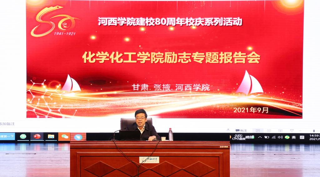 9月29日下午,在河西讲堂,86届员工、现兰州石化职业技术公司党委委员、纪委书记蒲卫晖作了题为“《化学 李灿与我们》——在学习和宣传李灿现象中一路同行”的报告,系统讲述了李灿的成长故事。他号召青年学子要学习李灿精神,爱祖国、爱家乡、爱化学、爱事业,要胸怀理想,志存高远,脚踏实地,勤奋刻苦,虚心求教、真诚友善、勇于挑战、懂得感恩,要踏着李灿的足迹,不负韶华,不辱使命,向前走,不回头。